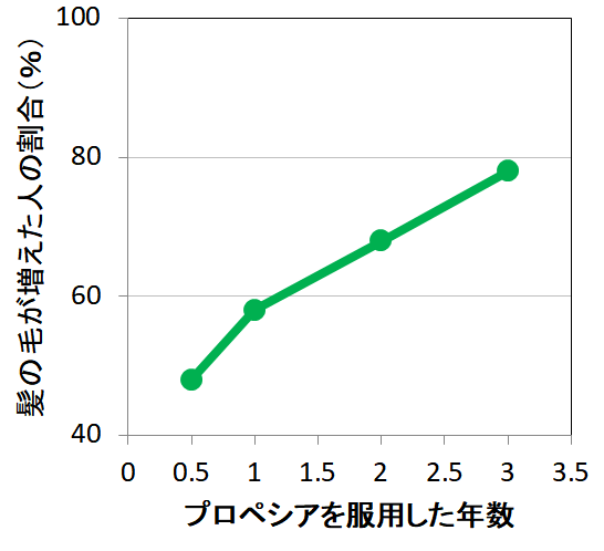 国内の臨床試験では半年で48%、1年で58%、2年で68%、3年で78%と毛髪が増える人が増加しました。