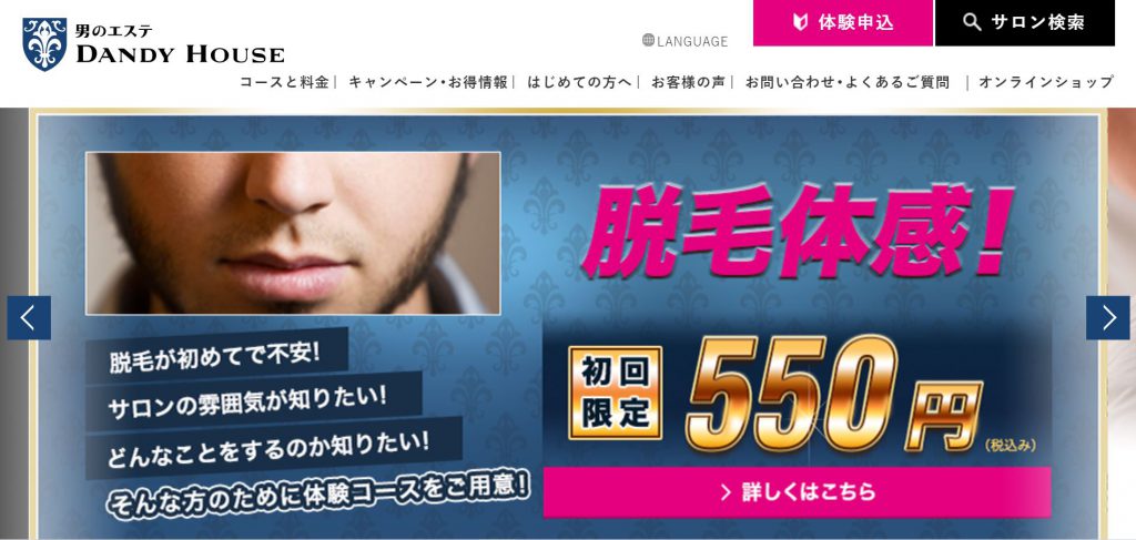 お世話になっている脱毛サロン。男性向けエステでは大手だと思います。少しお高い気はしますが、その分効果はあるし、仕事も丁寧だと思われます。